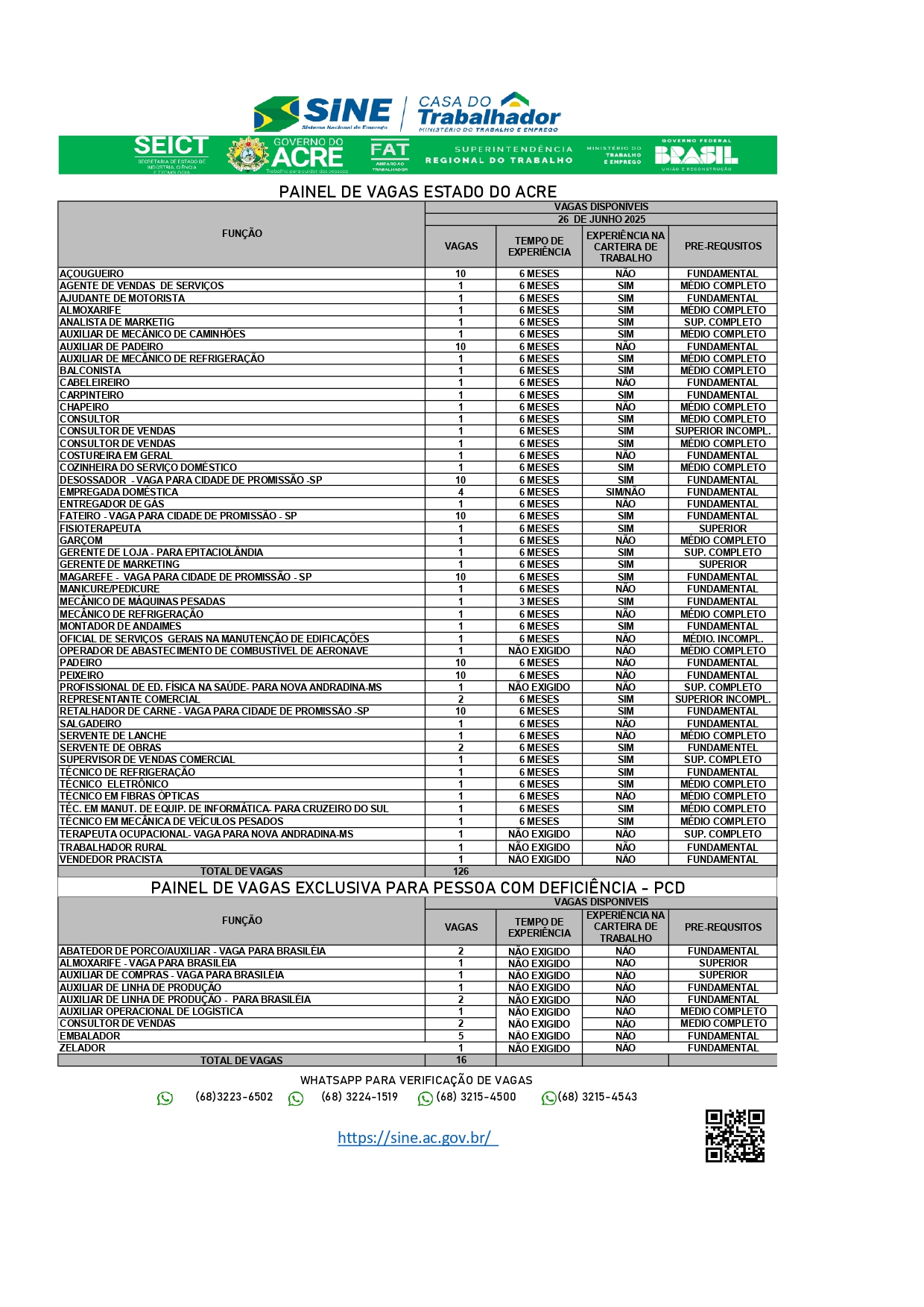 O Sistema Nacional de Emprego do Acre (Sine-AC) oferece 142 vagas de emprego para a população de Rio Branco nesta quinta-feira (26). Destas vagas, 16 são destinadas exclusivamente às pessoas com deficiência.