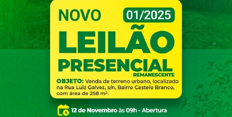 O segundo certame, o Leilão Eletrônico Remanescente nº 09/2025, sob responsabilidade da Sead, será realizado na quarta-feira, 12. O bem a ser leiloado é um terreno com 258 m², localizado na Rua Luiz Galvez, nº 297, Conjunto Castelo Branco, registrado sob a matrícula nº 7.194, no 2º Ofício de Registro de Imóveis de Rio Branco.