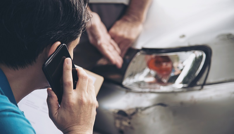 Insurance agent working during on site car accident claim process - people and car insurance claim concept