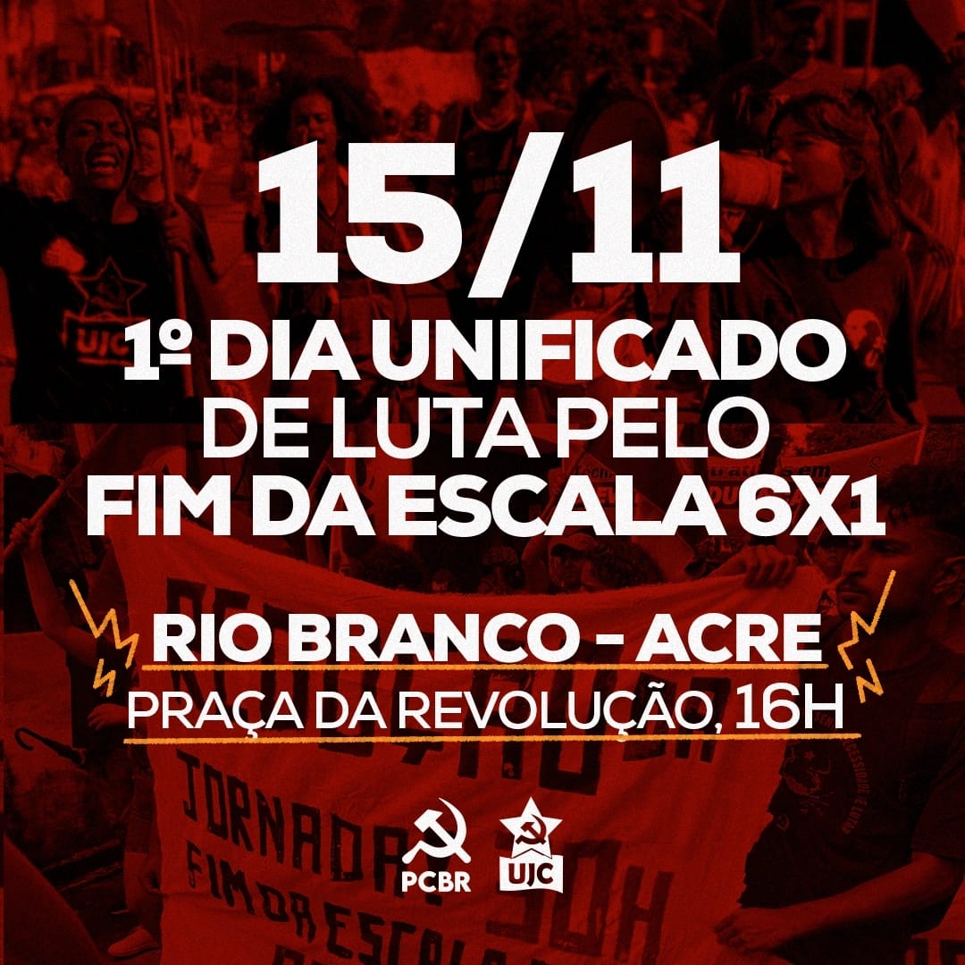 Diretório Central dos Estudantes (DCE) da Universidade Federal do Acre (UFAC) se une ao movimento nacional pelo fim da jornada de trabalho em escala 6×1, que exige uma carga horária de seis dias seguidos com apenas um de folga, nesta sexta-feira (15) feriado da Proclamação da República. A manifestação ocorrerá na Praça da Revolução, em Rio Branco, às 16h, com o objetivo de alcançar uma jornada de 30 horas semanais, com quatro dias de trabalho e três de descanso, sem redução salarial.