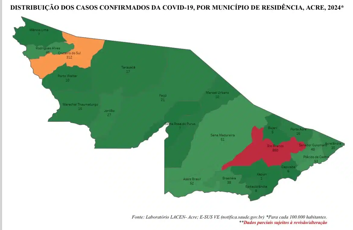 Rio Branco e Cruzeiro do Sul são as cidades com mais casos positivos para o novo coronavírus desde o início do ano, com 880 e 312, respectivamente. Em compensação, Xapuri, na região do Alto Acre, apresenta o menor índice de infecções em 2024, com apenas um caso confirmado.