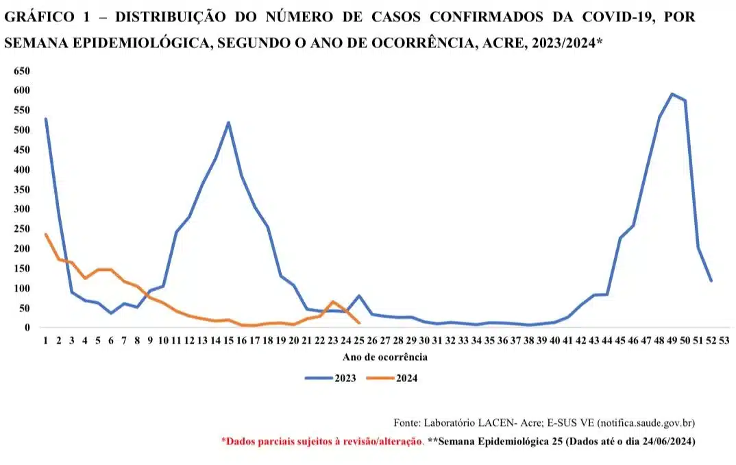 De acordo com o boletim da Covid-19, com base na semana epidemiológica 25 de 2024, disponibilizado nesta semana pela Secretaria de Estado de Saúde (Sesacre), após mais de um mês o Acre voltou a registrar óbito pelo vírus.