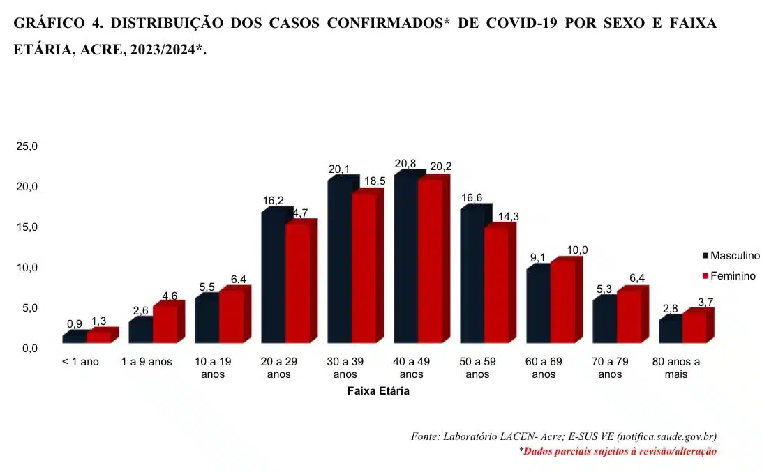 Ainda segundo do boletim, nos anos de 2023 e 2024 dos casos positivos, em relação ao sexo, 3.759, cerca de 38,9%, casos são do sexo masculino e 5.915, em torno de 61,1%, do sexo feminino. Quanto à faixa etária dos casos confirmados, pode ser observado que a maior proporção encontra-se entre 40 a 49 anos, nos dois sexos.