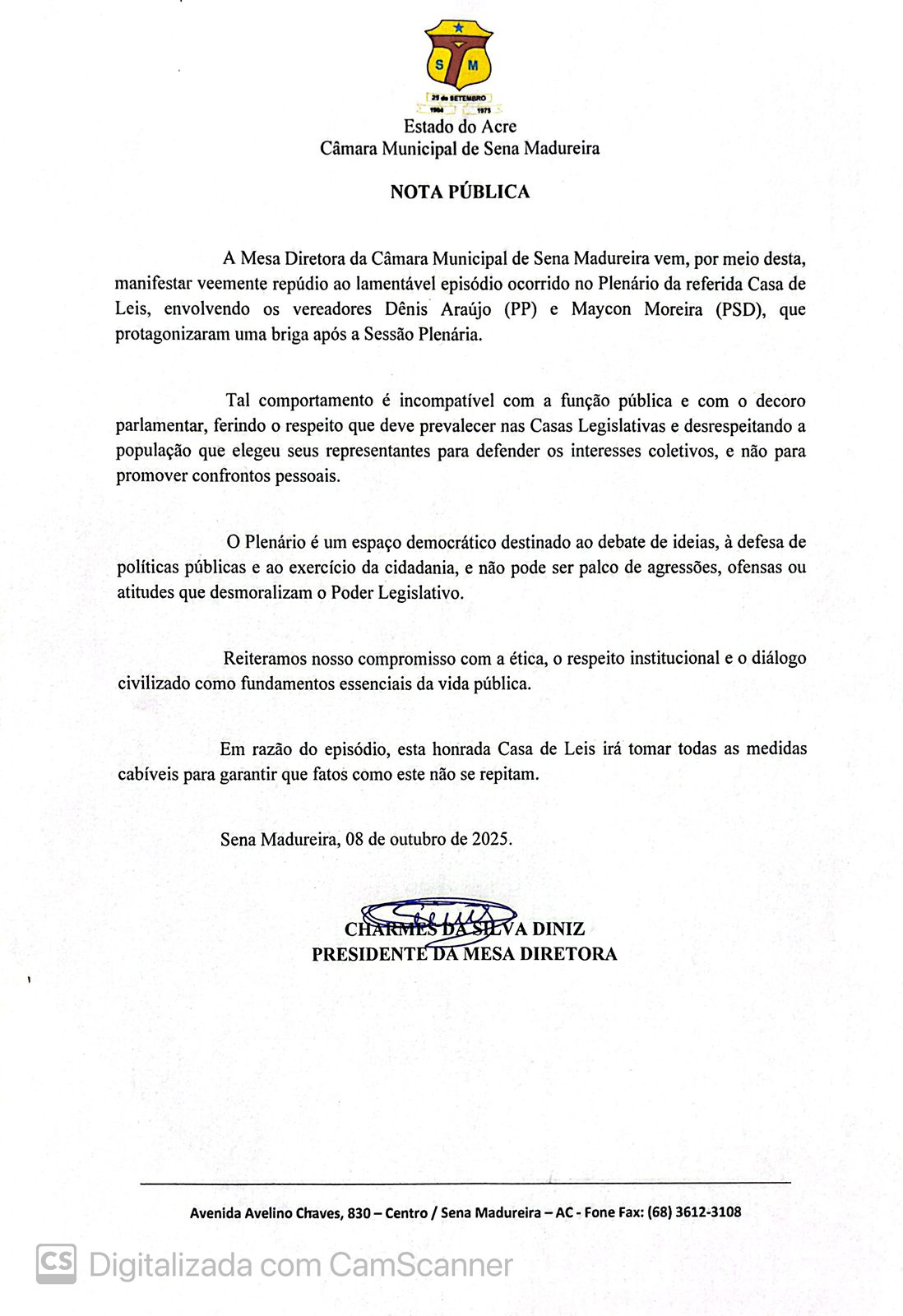 Com a repercussão do caso Câmara Municipal de Sena Madureira publica nota, acompanhe na íntegra: