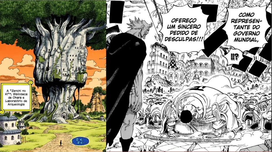 Contudo, esse tipo de construção não é algo recente no mangá de Oda. Em 2008, no capitulo 502 “O incidente com o Tenryuubitto” publicado no mês de junho, ele montou um quadro tendo seu protagonista envolvido na ação.