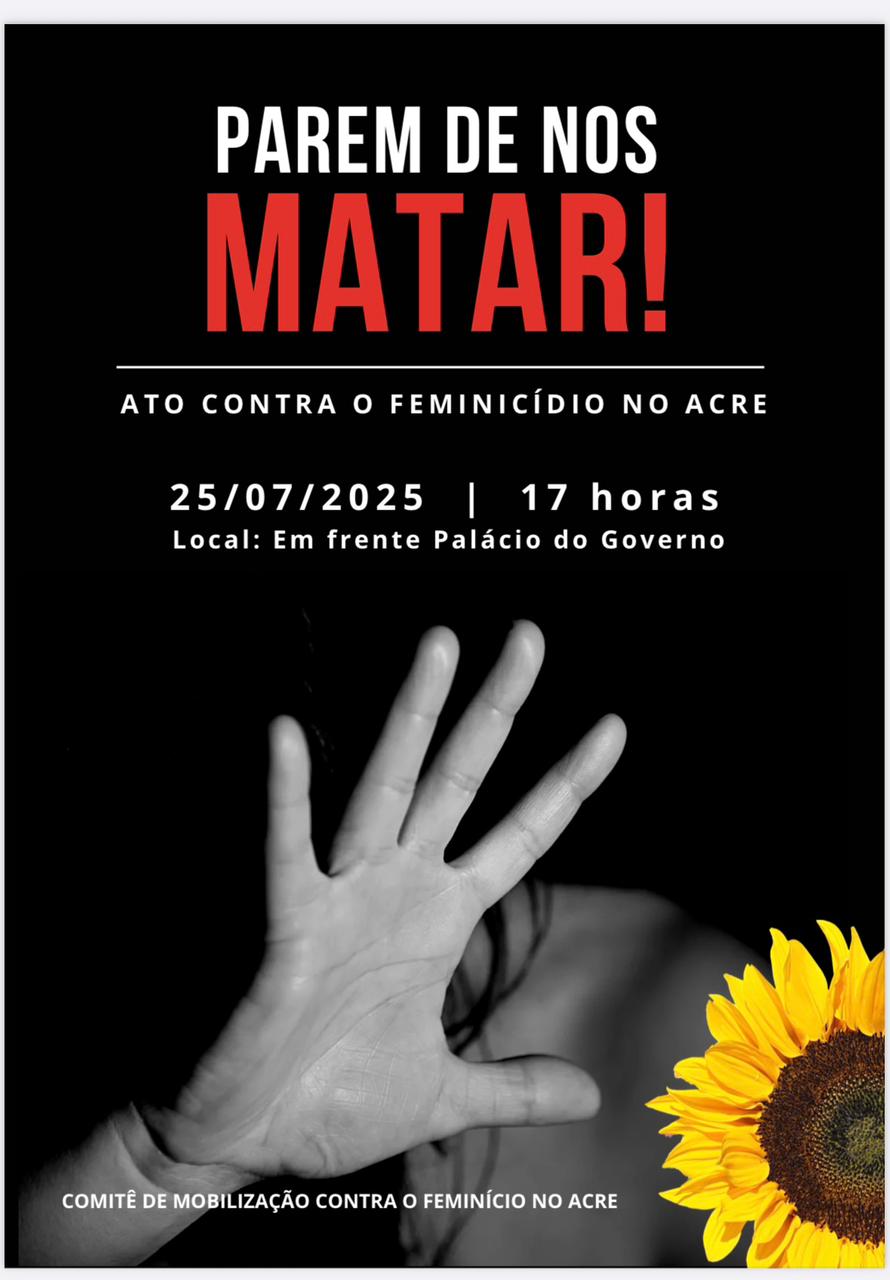 Será realizado um ato público contra o feminicídio em frente ao Palácio Rio Branco, em Rio Branco, nesta sexta-feira (25), às 17h. A mobilização é organizada pelo Comitê de Mobilização Contra o Feminicídio no Acre e cobra respostas do poder público diante dos cinco casos registrados no estado somente em 2025.