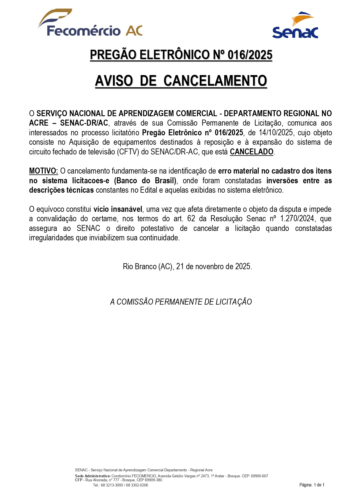Aviso Cancelamento Pregão Eletrônico n° 016/2025 Senac – DR/AC