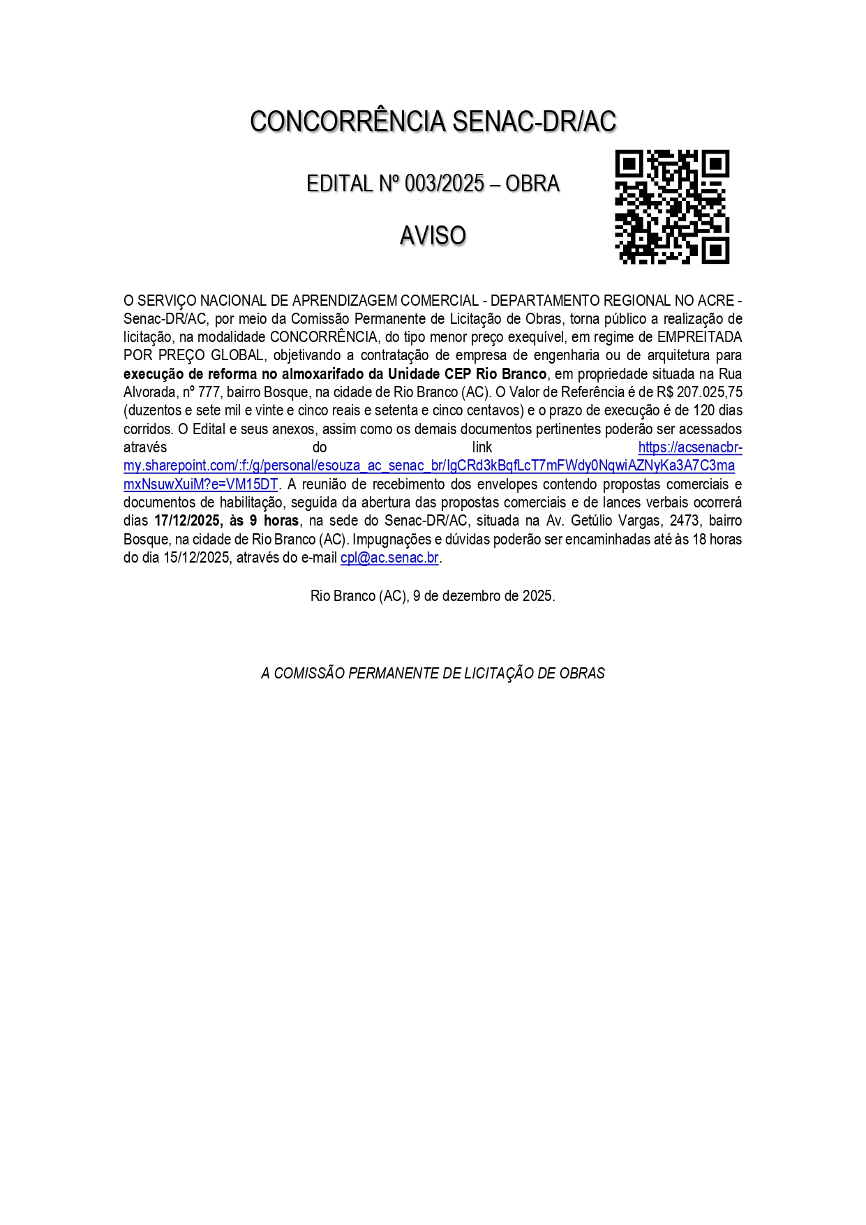 Aviso Concorrência Edital n° 003/2025 – Obra Senac-DR/AC