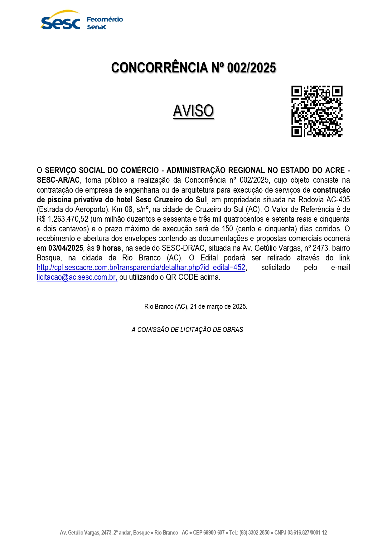 Aviso Concorrência nº 002/2025 Sesc-DR/AC