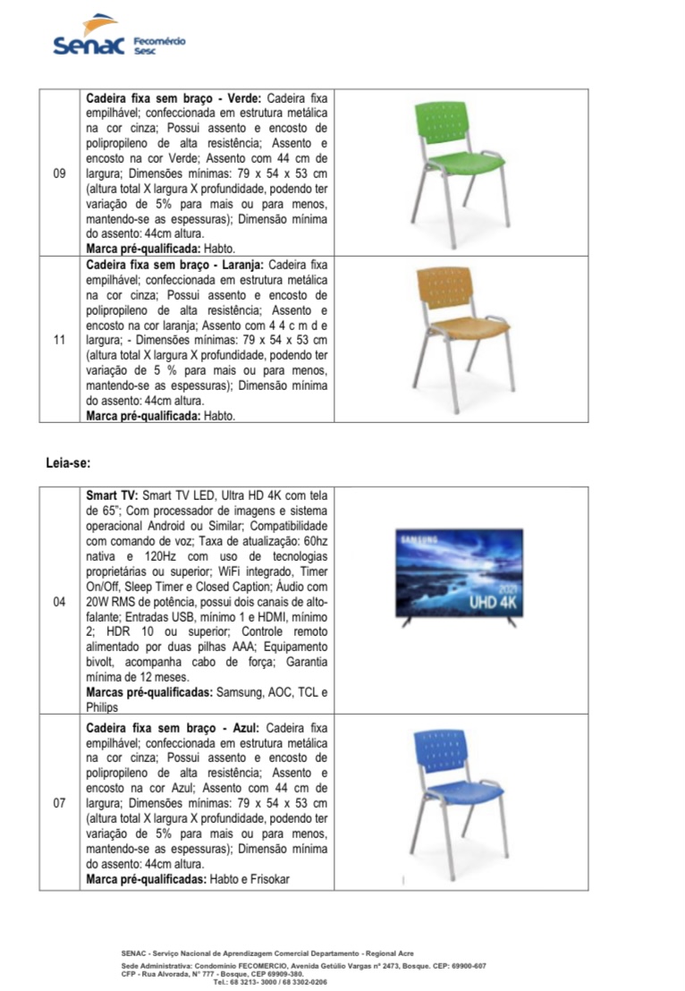 ESCLARECIMENTO DE DÚVIDAS: Até às 18h do dia 10/04/2023, por meio de correspondência dirigida à Comissão Permanente de Licitações, através do e-mail cpl@ac.senac.br.