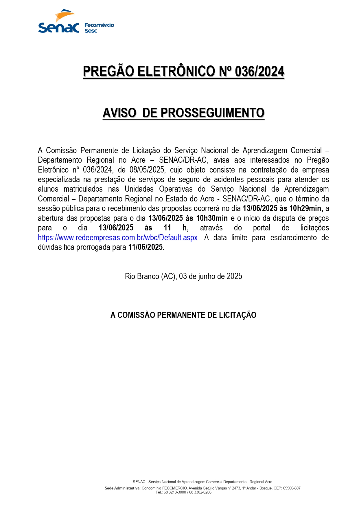 Aviso de Prosseguimento Pregão Eletrônico n° 036/2024 Senac-AR/AC