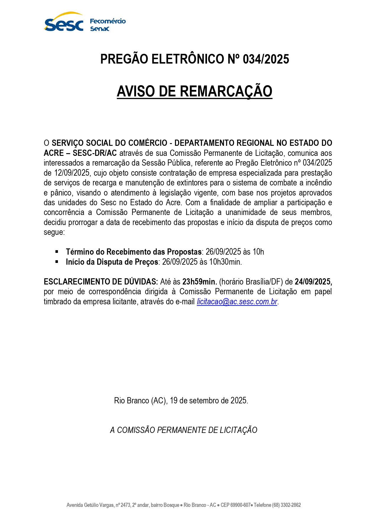 Aviso de Remarcação Pregão Eletrônico n° 034/2025 Sesc-DR/AC