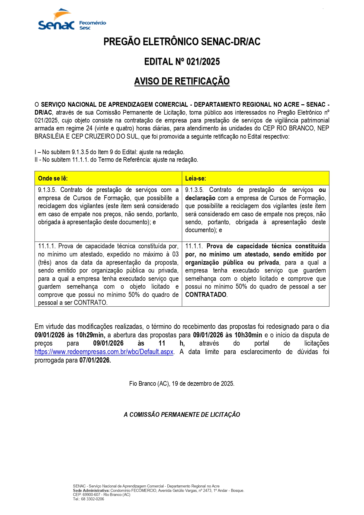 • Aviso de Suspensão Concorrência Nº 007/2025 Senac-DR/AC 2 de fevereiro de 2026