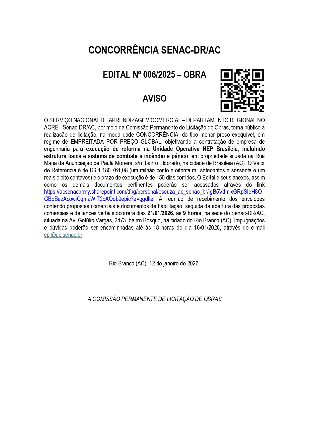 Aviso Edital Concorrência Senac-DR/AC n° 006/2025 Obra