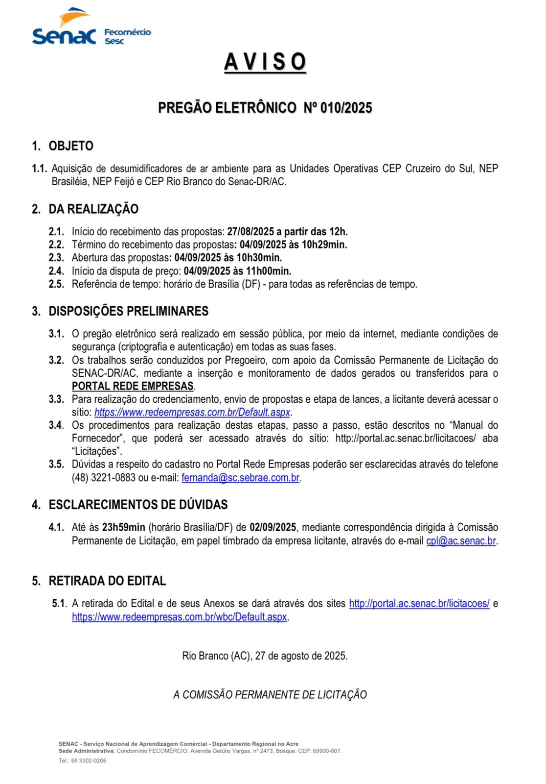 Aviso Pregão Eletrônico n° 010/2025 Senac-DR/AC