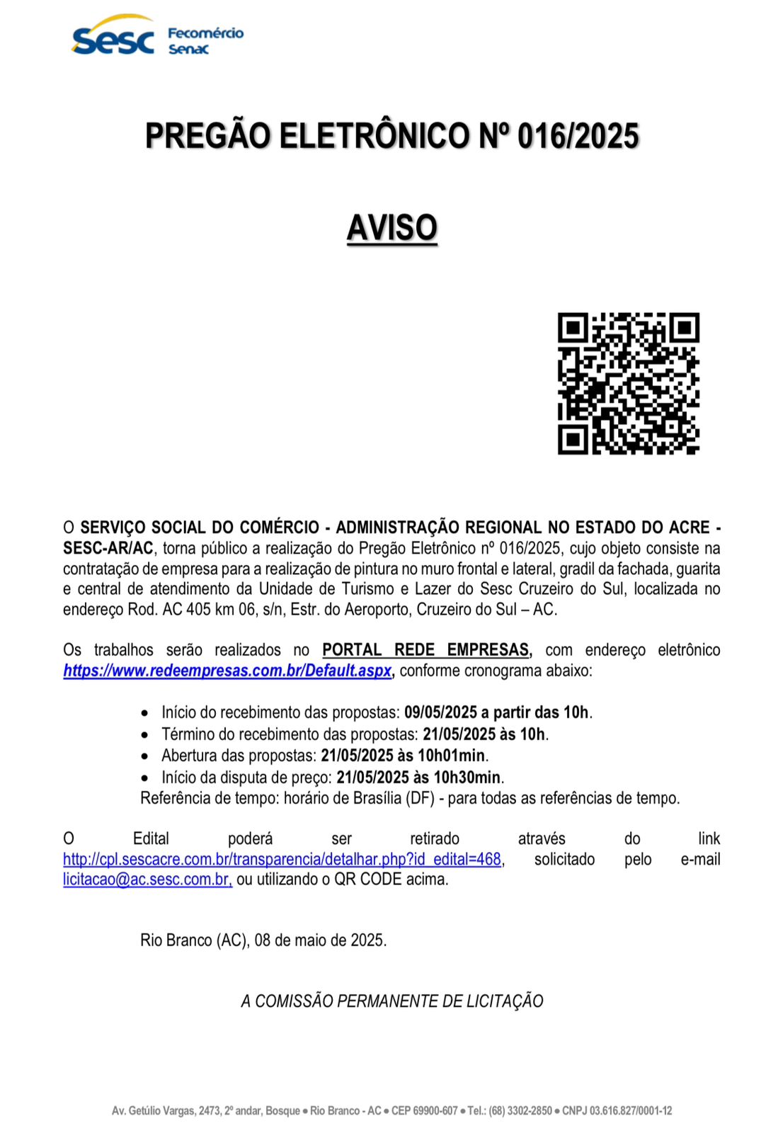 Aviso Pregão Eletrônico n° 016/2025 Sesc-DR/AC
