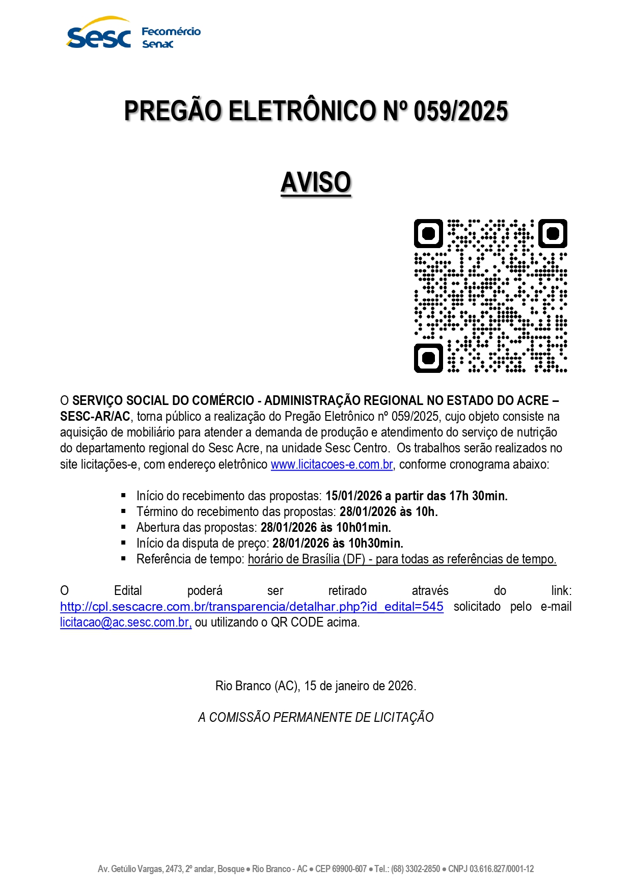 Aviso Pregão Eletrônico n° 059/2025 Sesc-AR/AC