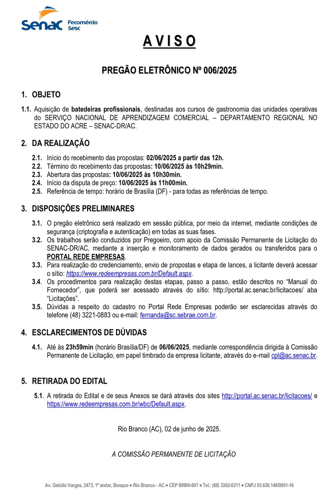 Aviso Pregão Eletrônico n°006/2025 Senac-DR/AC