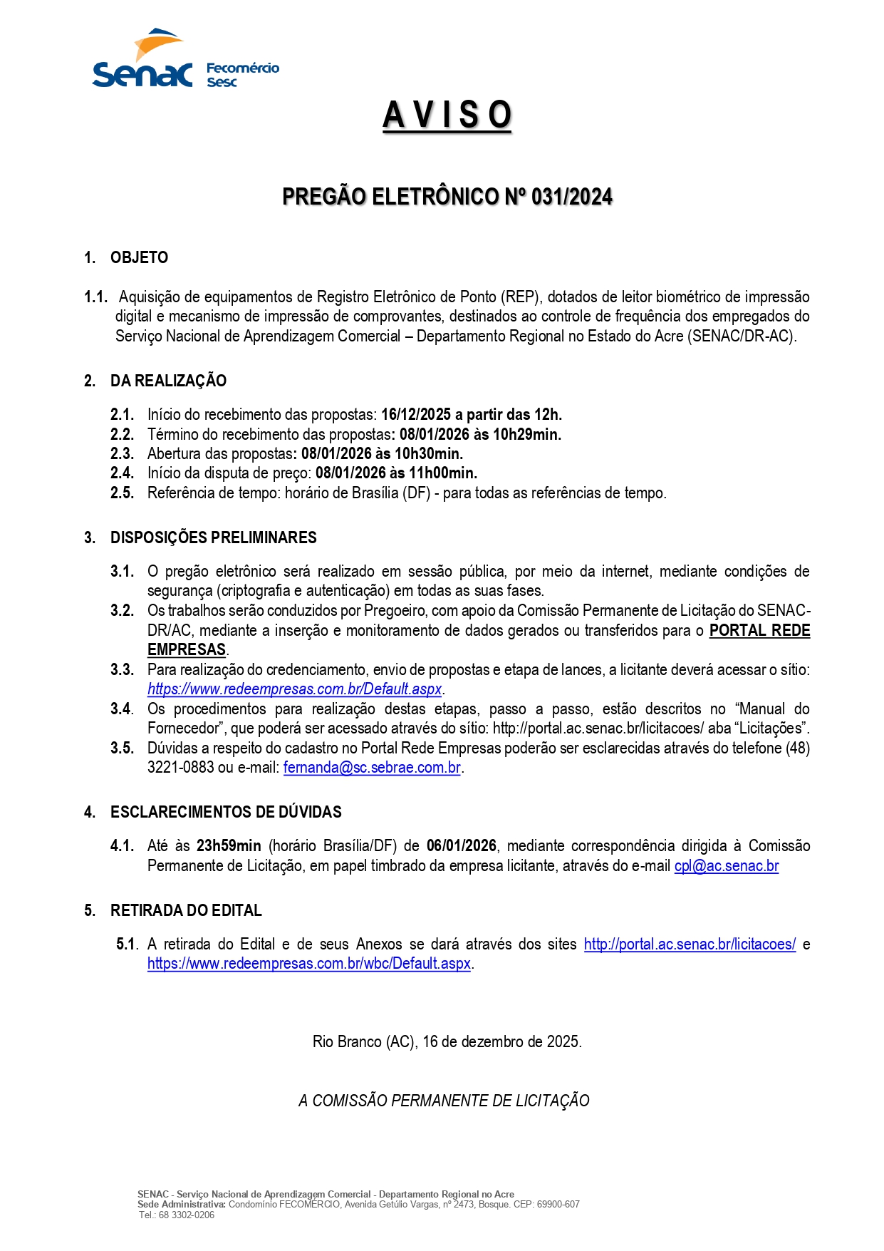 Aviso Pregão Eletrônico n°031/2024 Senac/DR-AC