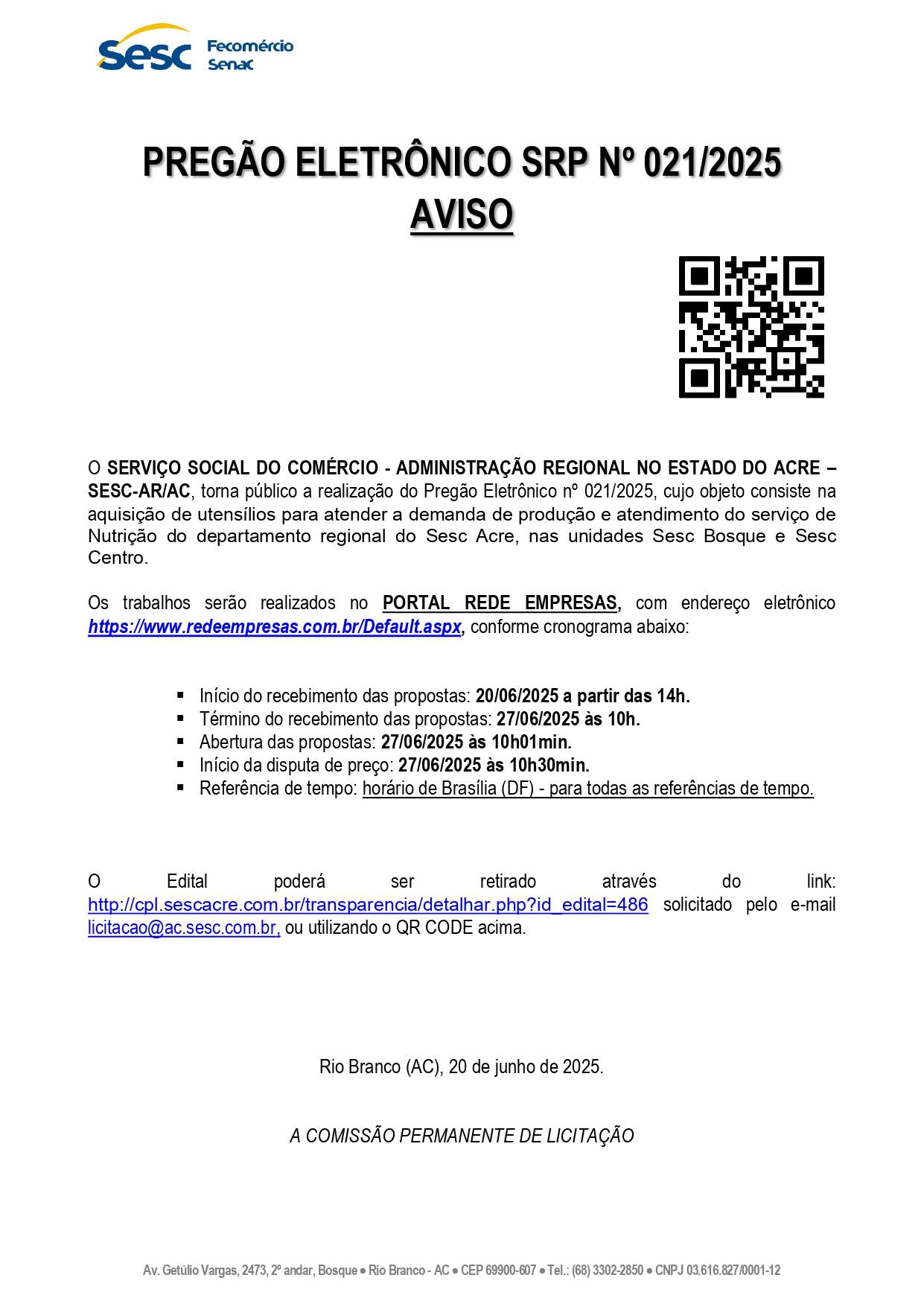 Aviso de Remarcação Concorrência n° 008/2025 Sesc-DR/AC