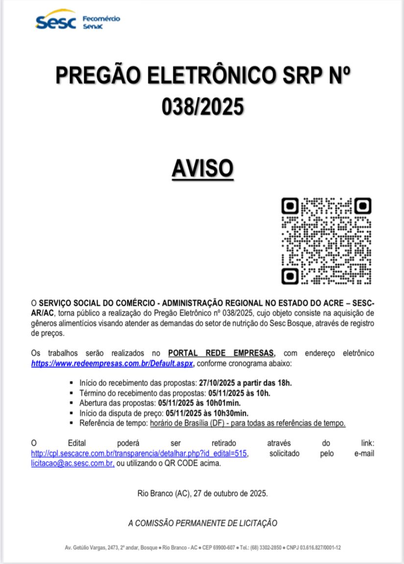 Aviso Pregão Eletrônico SRP Nº 038/2025 Sesc AR/AC