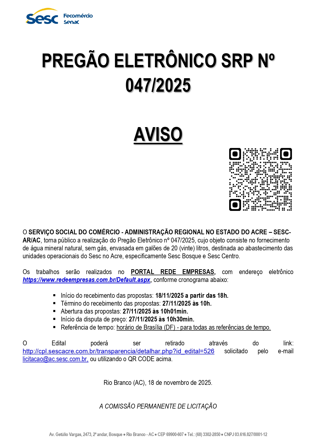 Aviso Pregão Eletrônico SRP Sesc-AR/AC n° 047/2025