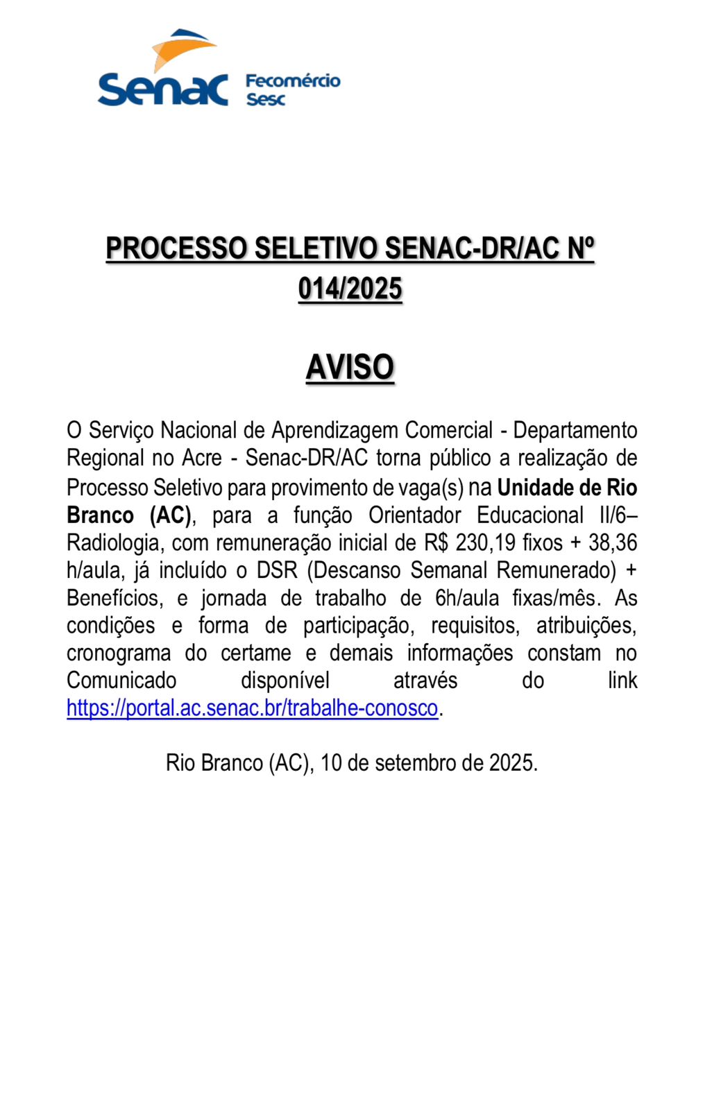 Aviso Processo Seletivo Senac-DR/AC n° 014/2025