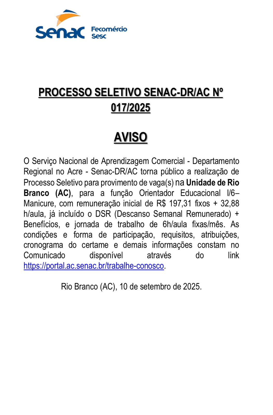 Aviso Processo Seletivo Senac-DR/AC n° 017/2025