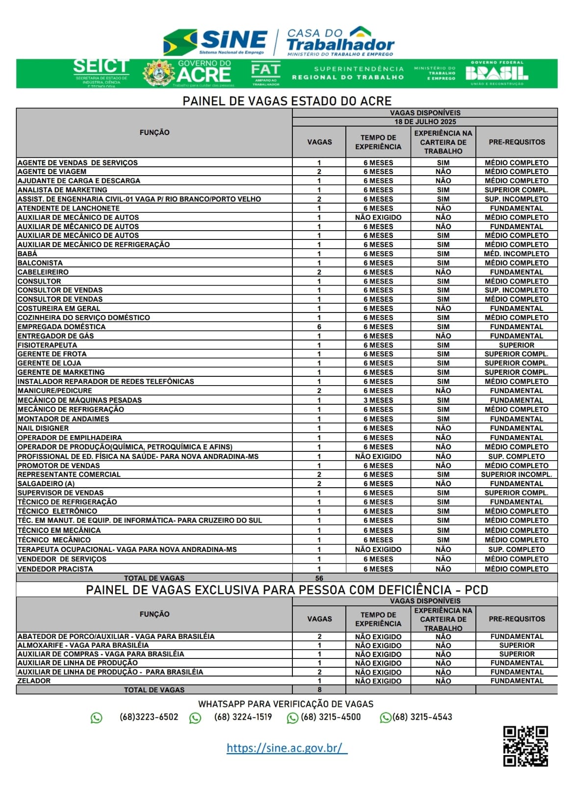 O Sistema Nacional de Emprego do Acre (Sine) oferece 64 vagas de emprego para a população de Rio Branco nesta sexta-feira (18). Destas vagas, 8 são destinadas exclusivamente à pessoas portadoras de deficiência.