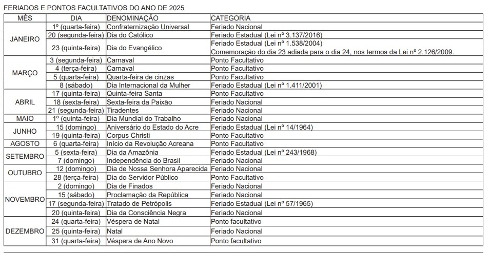 Foi estabelecido o decreto que torna público o calendário oficial de feriados e pontos facultativos para o ano de 2025, em publicação feita nesta sexta-feira (20), por meio do Diário Oficial do Estado (DOE). A medida visa organizar o funcionamento dos órgãos e entidades do Poder Executivo estadual, sem prejuízo dos serviços essenciais prestados à população.