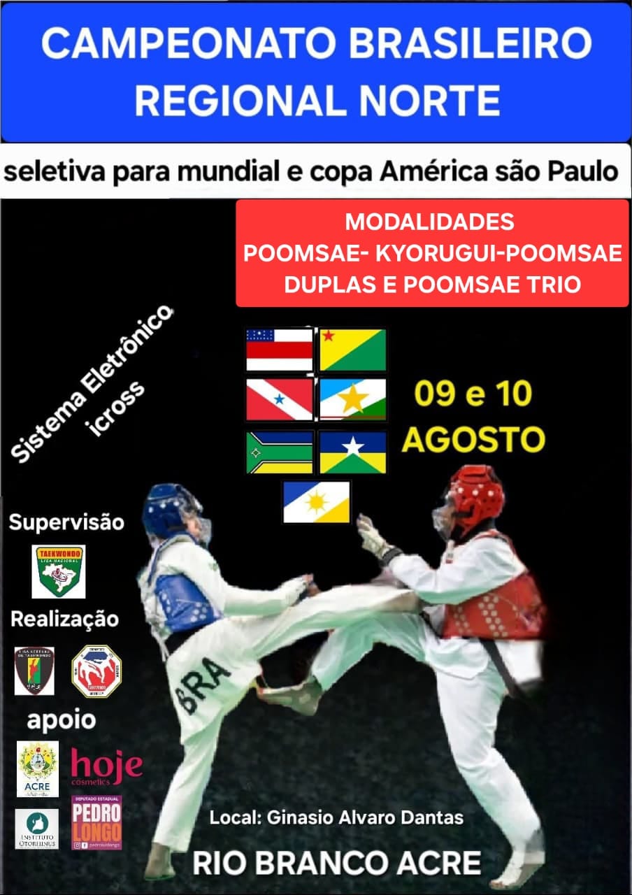 Nos dias 9 e 10 de agosto, a cidade de Rio Branco, será sede do Campeonato Brasileiro Regional Norte de Taekwondo, um dos eventos mais importantes da modalidade na região. A competição reunirá mais de 800 atletas de todos os estados do Norte do Brasil e será uma etapa classificatória para a Copa América e o Campeonato Mundial, ambos previstos para ocorrer em São Paulo no mês de outubro.