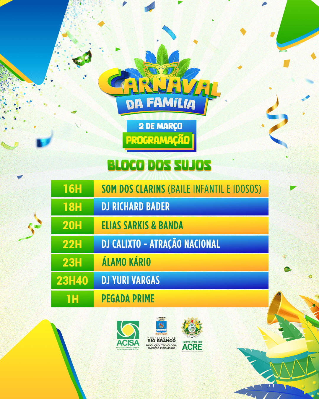 O terceiro dia do Carnaval da Família em Rio Branco, aconteceu neste domingo, 2 de março, com o Bloco dos Sujos. O evento é uma parceria entre o governo do Acre, a Prefeitura de Rio Branco e a Associação Comercial, Industrial e Agrícola do Acre (Acisa). A programação iniciou às 16h, com a orquestra Som dos Clarins, que trouxe um baile especial para crianças e idosos.