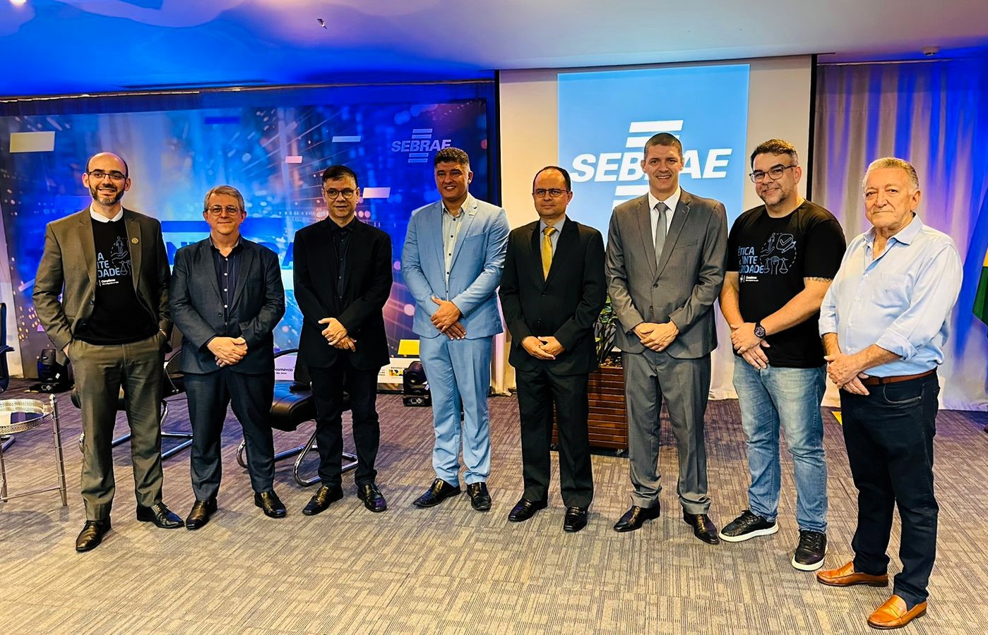 Superintendente do Sebrae no Acre, Marcos Lameira, Monica Paz de Souza, Analista de Controle Externo do TCE, Leonardo Lani, Superintendente Regional do Trabalho e Emprego no Acre, Osmar Nilo, Superintendente da Controladoria Regional da União no Acre, o Presidente do TRE-AC, Desembargador Júnior Alberto, Assuero Veronez, Presidente do Conselho Deliberativo Estadual do Sebrae/Ac e o Vandré Prado Diretor do Sebrae.