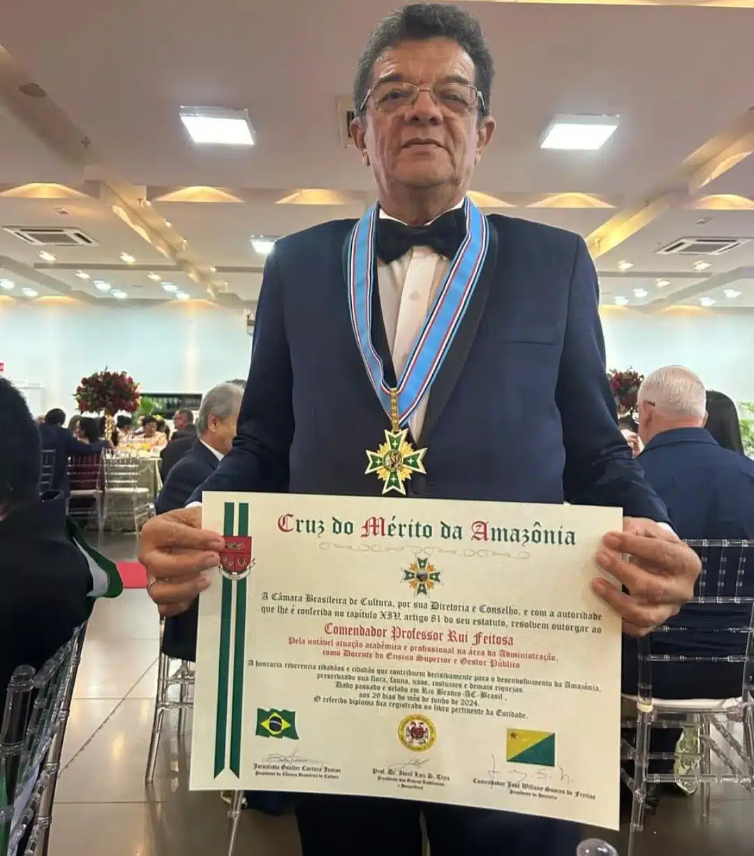 EM NOITE ELEGANTE no chic e aconchegante Afa Jardim foram homenageadas várias personalidades que fazem a diferença no desenvolvimento social, cultural e econômico da Amazônia. A segunda edição aconteceu no dia 29 de junho de 2024, em Rio Branco, Acre, realizado pela Câmara Brasileira de Cultura ” Ícones da Amazônia “. Este evento anual visa reconhecer personalidades e instituições que fazem a diferença no desenvolvimento social, cultural e econômico da Amazônia. Entre os homenageados deste ano, destacaram-se importantes profissionais ligados ao Conselho Regional de Administração do Acre (CRA/ACRE) e outros administradores renomados. Dentre eles, citamos o professor Rui Feitosa com a Honraria, Cruz do Mérito da Amazônia, Grau Comendador. Reconhecimento pela dedicação ao desenvolvimento social e cultural da Amazônia através de sua atuação educacional e comunitária. Posição: Ex-presidente do CRA/ACRE e agora Conselheiro Regional