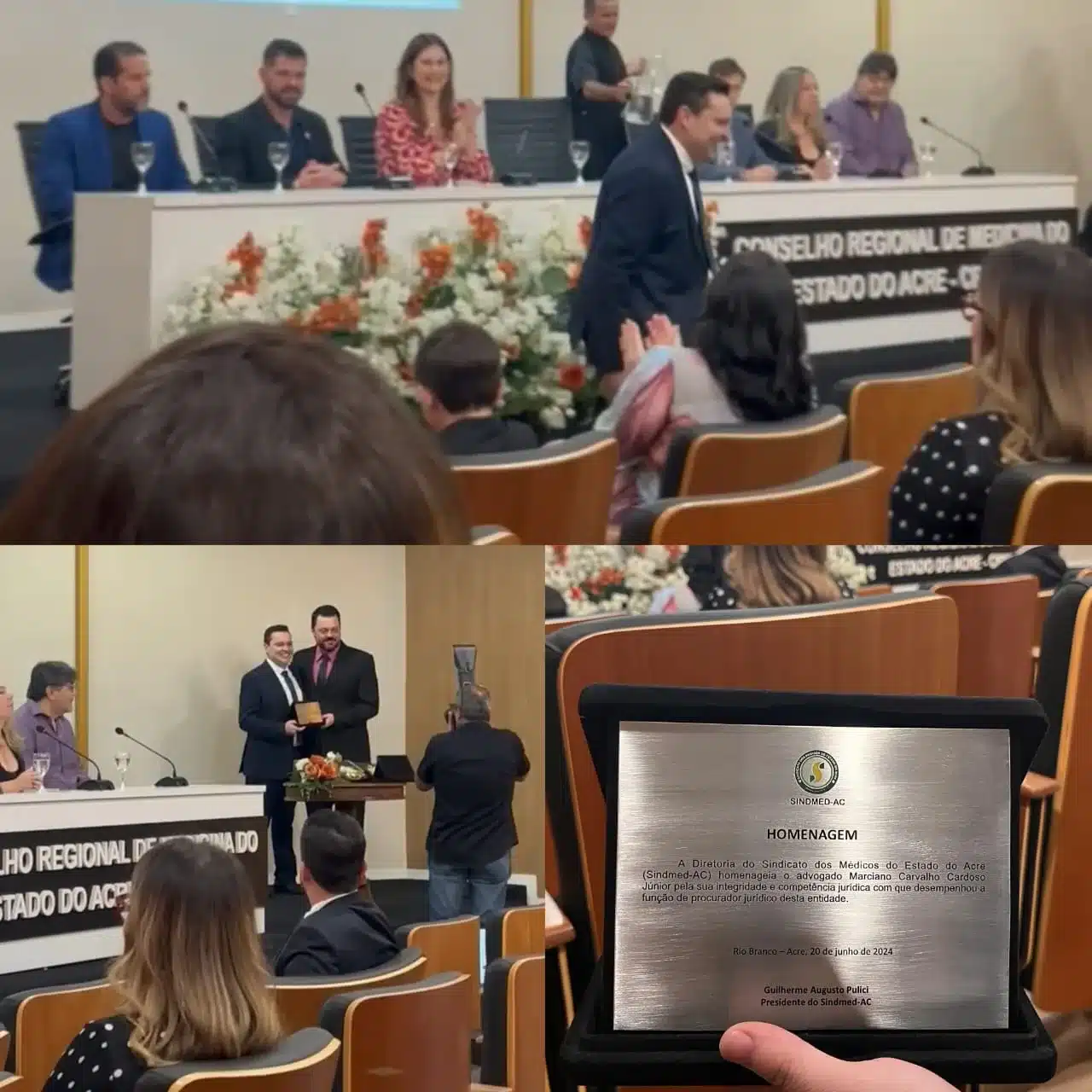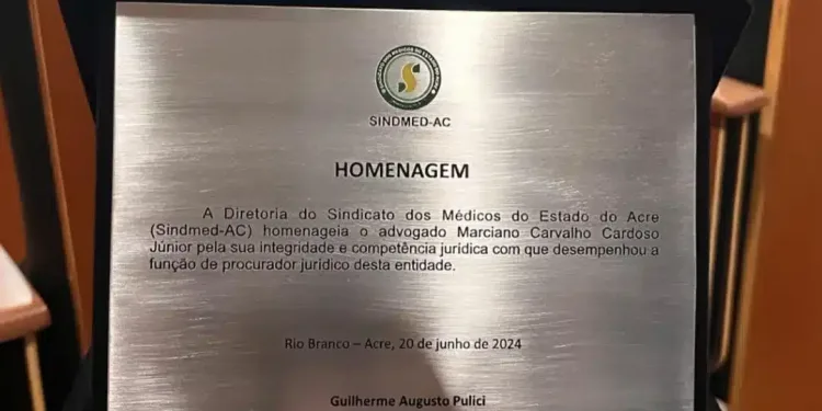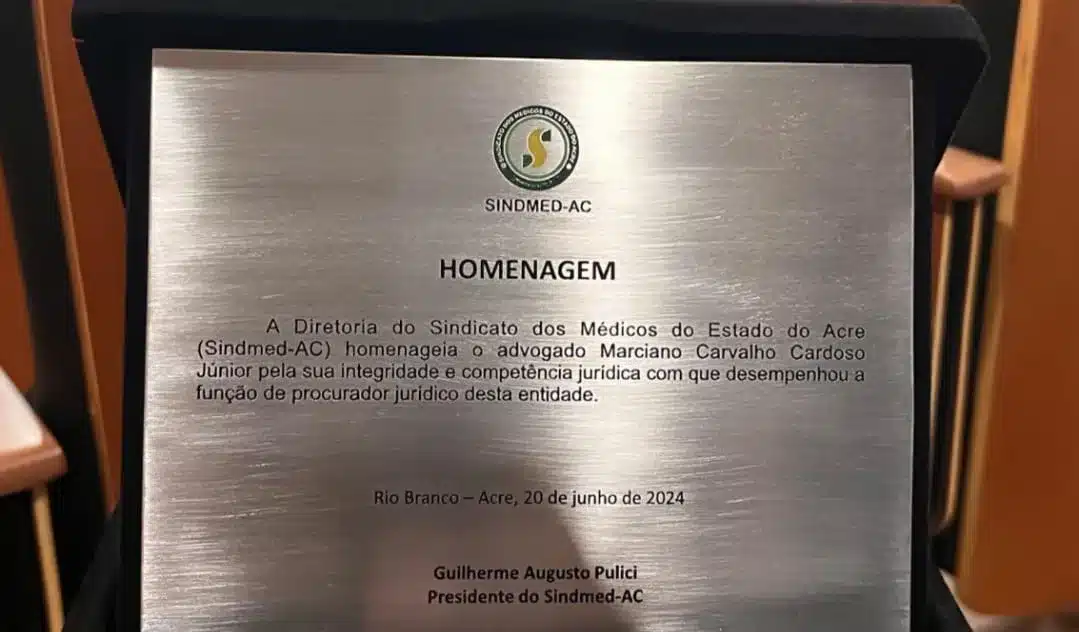 APLAUSOS – O requisitado advogado, Dr Marciano Cardoso, recebeu homenagem da Diretoria do Sindicato dos Médicos do Estado do Acre (SINDMED-AC) por sua dedicação e defesa de liderança e representatividade nas lutas da categoria médica