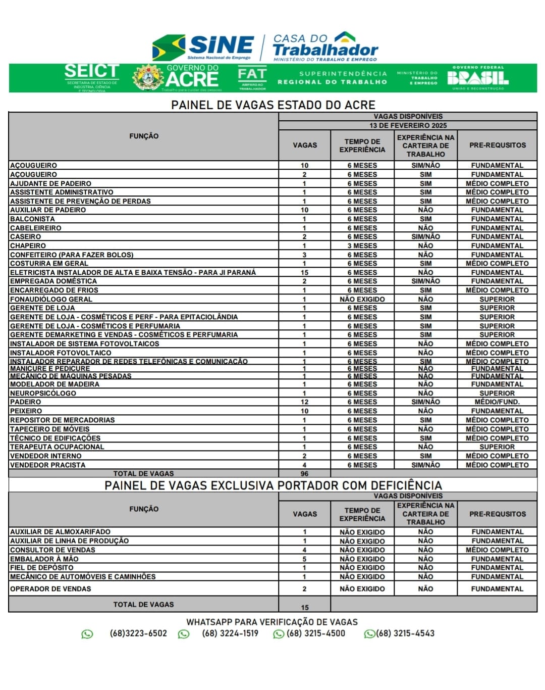 O Sistema Nacional de Emprego do Acre (Sine) oferece 111 vagas de emprego para a população de Rio Branco nesta quinta-feira (13). Destas vagas, 15 são destinadas exclusivamente às pessoas com deficiência.