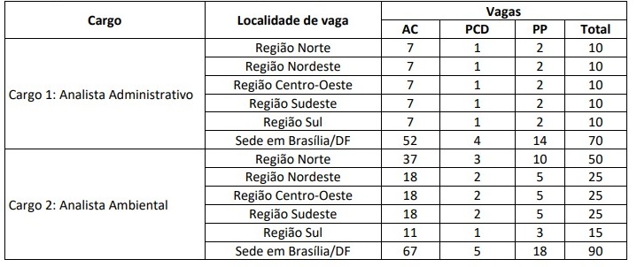 As oportunidades são para os cargos de Analista Administrativo e Analista Ambiental, com 350 vagas de nível superior. Para o cargo de Analista Administrativo, é exigido diploma de graduação em qualquer área reconhecida pelo Ministério da Educação (MEC). As atribuições incluem a execução de atividades administrativas e logísticas relacionadas às competências legais do ICMBio. Já para o cargo de Analista Ambiental, também é necessário possuir diploma em qualquer área de formação reconhecida pelo MEC.