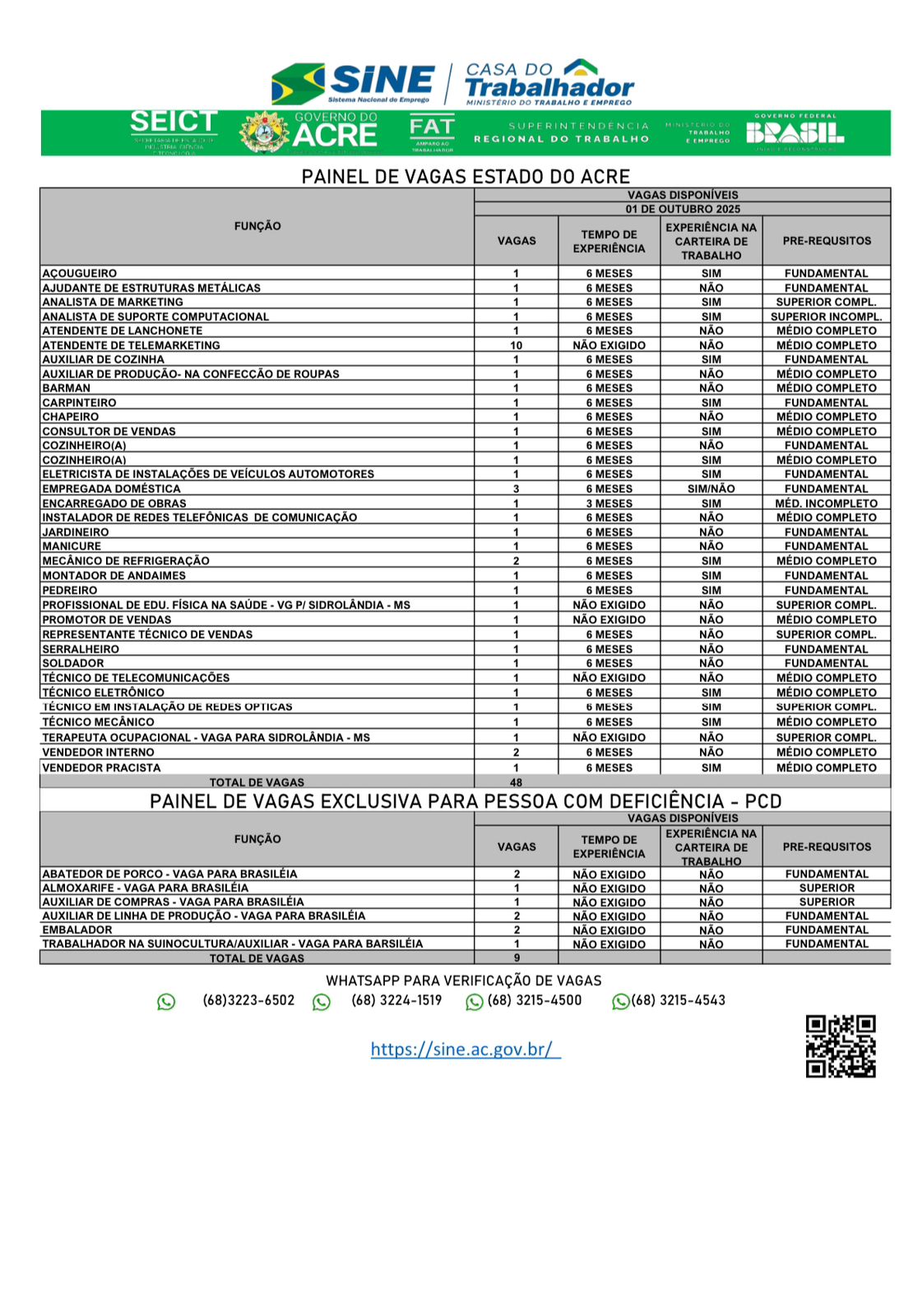 O Sistema Nacional de Emprego do Acre (Sine) oferece 48 vagas de emprego para a população de Rio Branco nesta quarta-feira (24). Destas vagas, nove são destinadas exclusivamente às pessoas com deficiência.