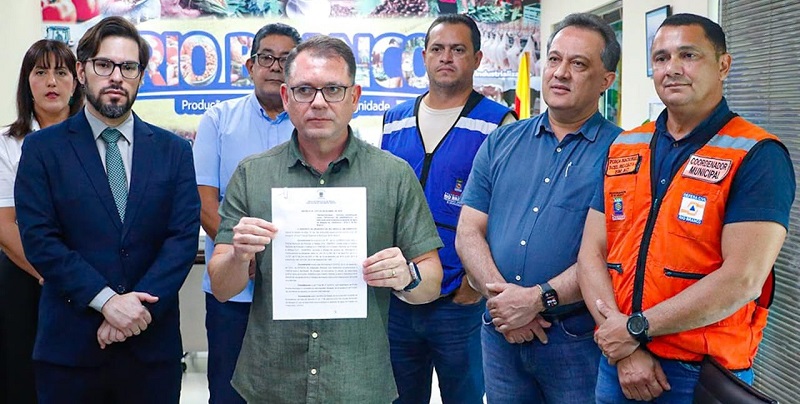 O prefeito de Rio Branco – em exercício, Alysson Bestene, acompanhado pelo representante da Coordenadoria Municipal de Defesa Civil (Comdec), do Serviço de Água e Esgoto de Rio Branco (Saerb) e demais secretários municipais, assinou nesta terça-feira (8), o decreto que prorroga a situação de emergência da Estação de Tratamento de Água (Eta) 2.