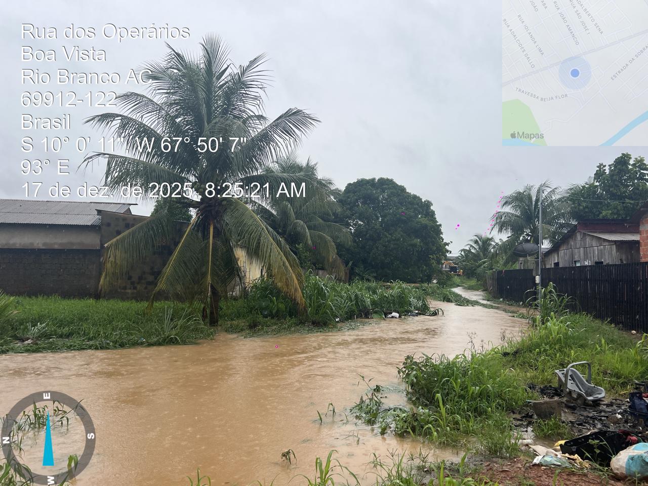 O município de Rio Branco enfrenta, desde as primeiras horas da madrugada desta quarta-feira (17), um grande volume de chuva. Mais de 70 milímetros foram registrados pela Defesa Civil do município até as 5h, o que fez com que os 268 mm esperados para o mês de dezembro fossem ultrapassados, chegando a mais de 285 mm. A média diária prevista para o período é de 8,9 mm.