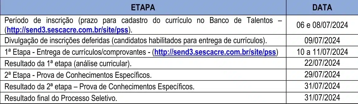 O Sesc-DR/AC torna público a realização do Processo Seletivo Simplificado n° 010/2024, para provimento de vaga(s) por prazo determinado, mediante as condições estabelecidas neste Comunicado.