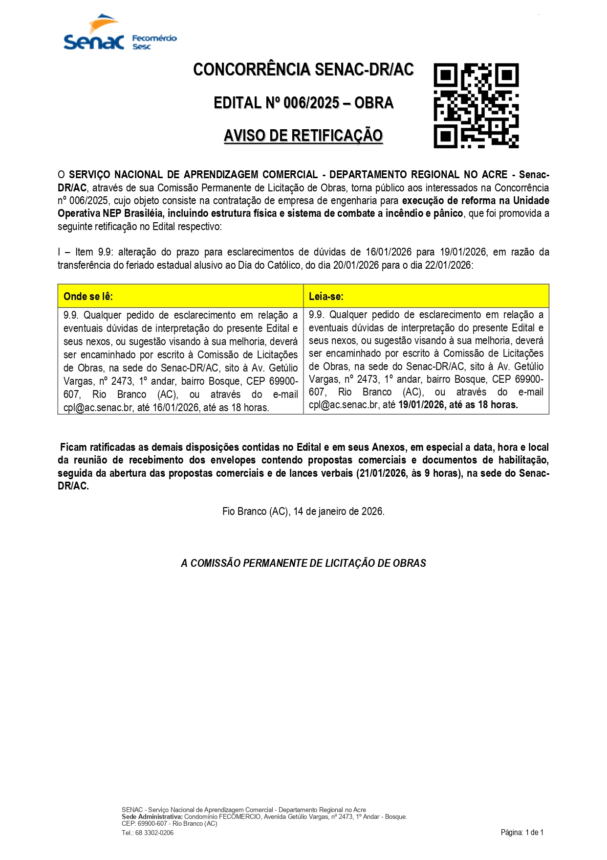 Concorrência Senac-DR/AC Edital n° 006/2025 – Obra / Aviso de Retificação