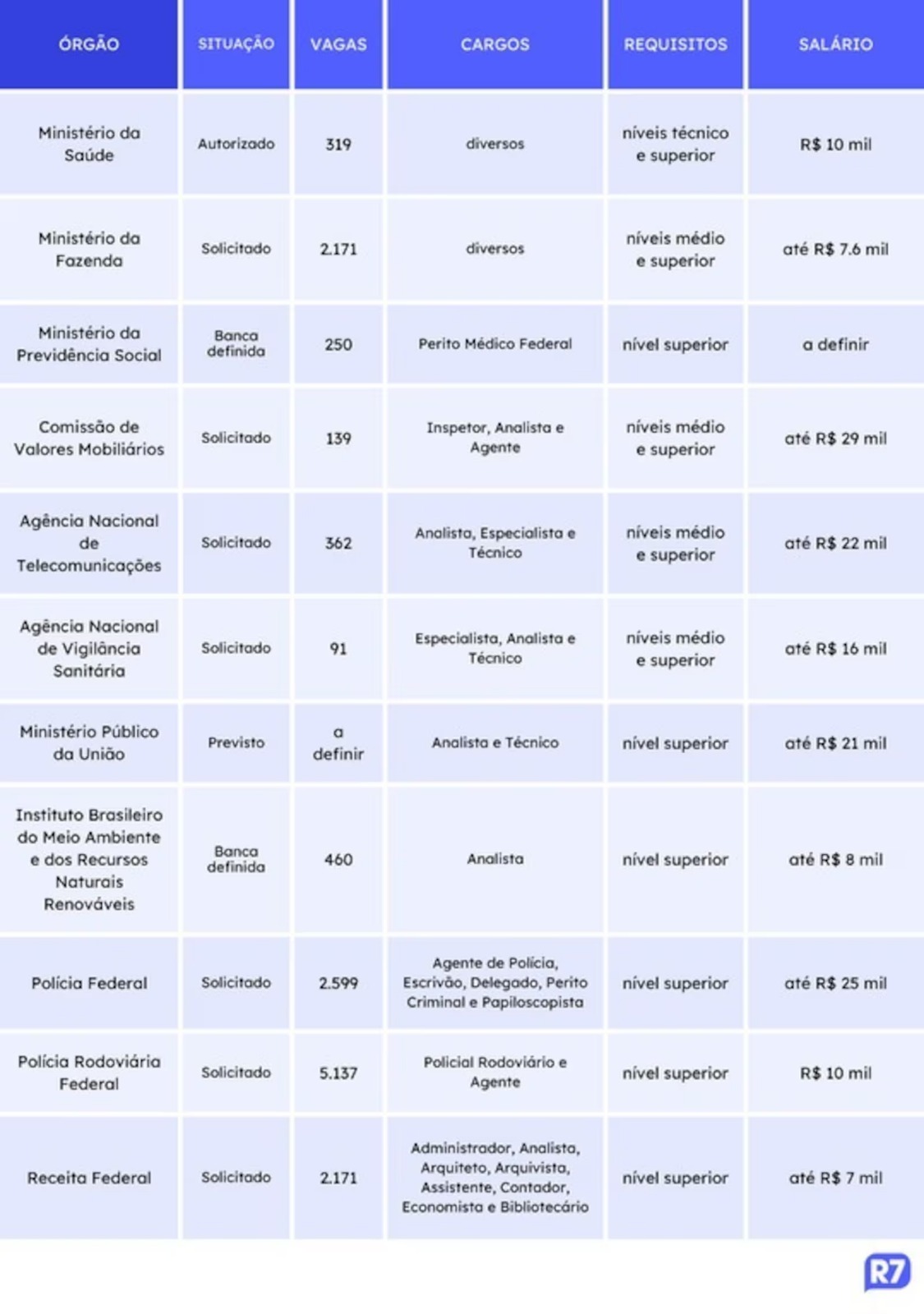 Concursos: Ministério da Saúde, Ministério da Previdência Social, Ibama.