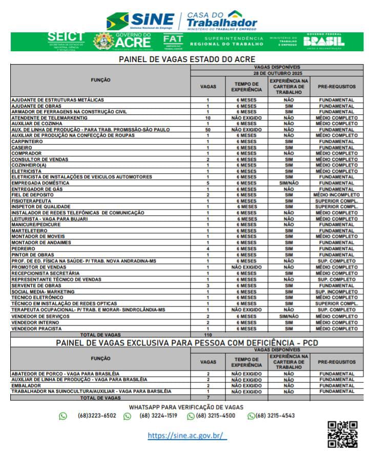 Confira as 117 vagas de emprego disponibilizadas pelo Sine Acre nesta terça-feira
