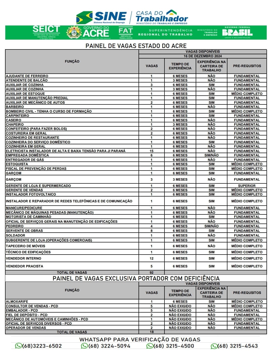 O Sistema Nacional de Emprego do Acre (Sine) oferece 110 vagas de emprego para a população de Rio Branco nesta segunda-feira (16), sendo dessas vagas, 18 são destinadas exclusivamente a pessoas portadoras de deficiência.