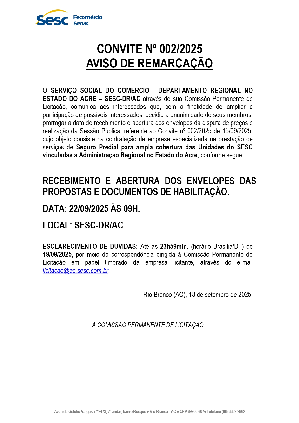 Convite Aviso de Remarcação n° 002/2025 Sesc-DR/AC