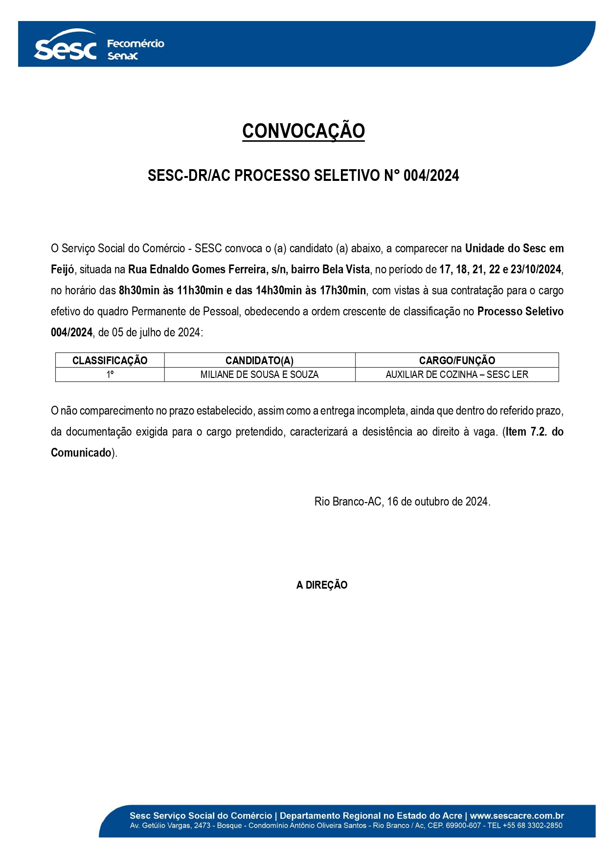Convocação Processo Seletivo n° 004/2024 Sesc-DR/AC