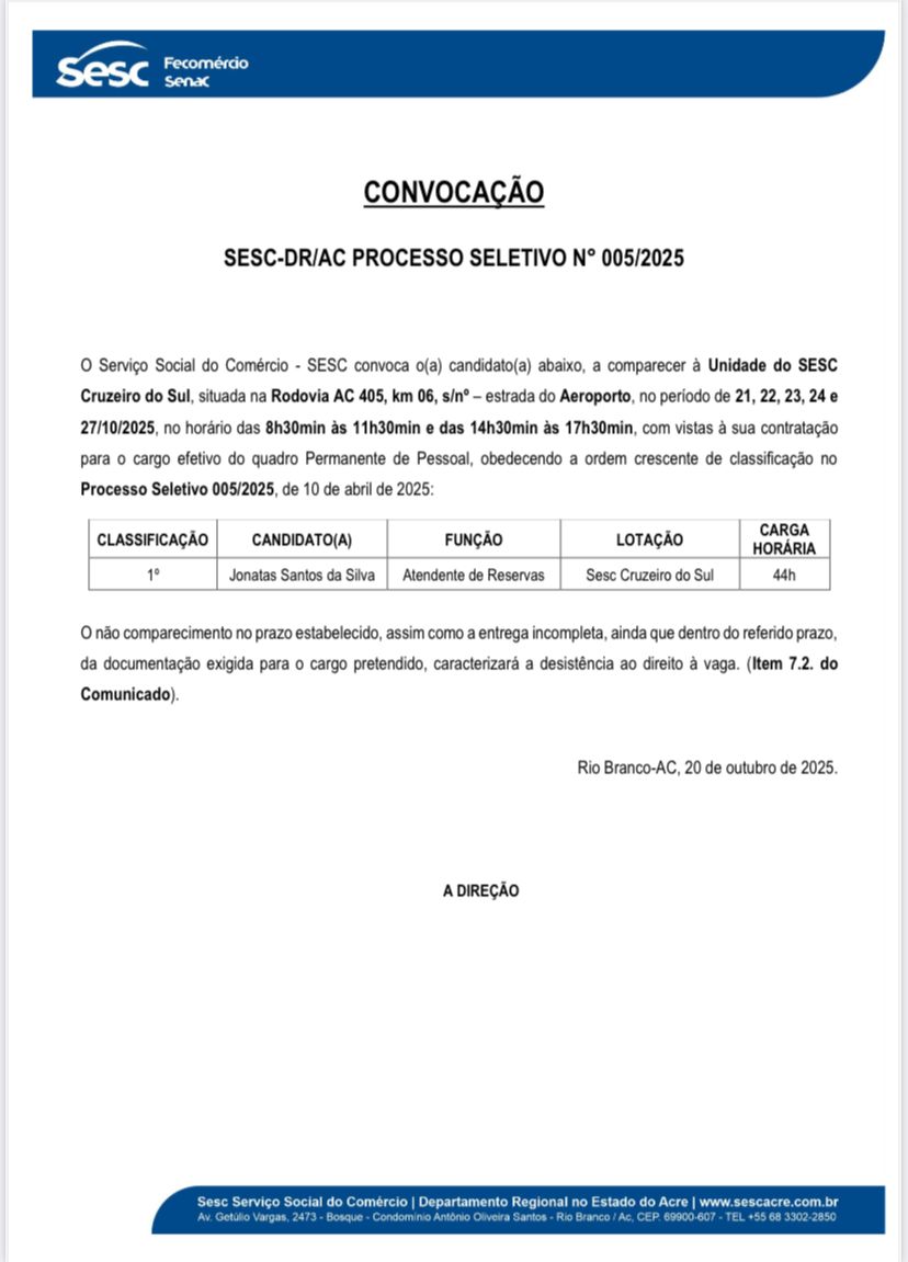 Convocação Processo Seletivo N° 005/2025 Sesc-DR/AC