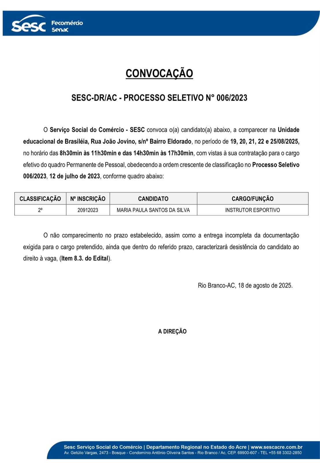 Convocação Processo Seletivo n° 006/2023 Sesc-DR/AC