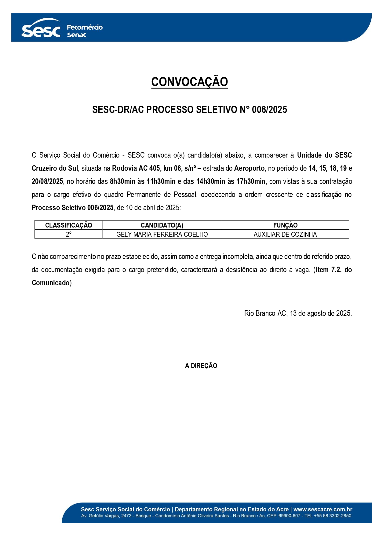 Convocação Processo Seletivo n° 006/2025 Sesc-DR/AC